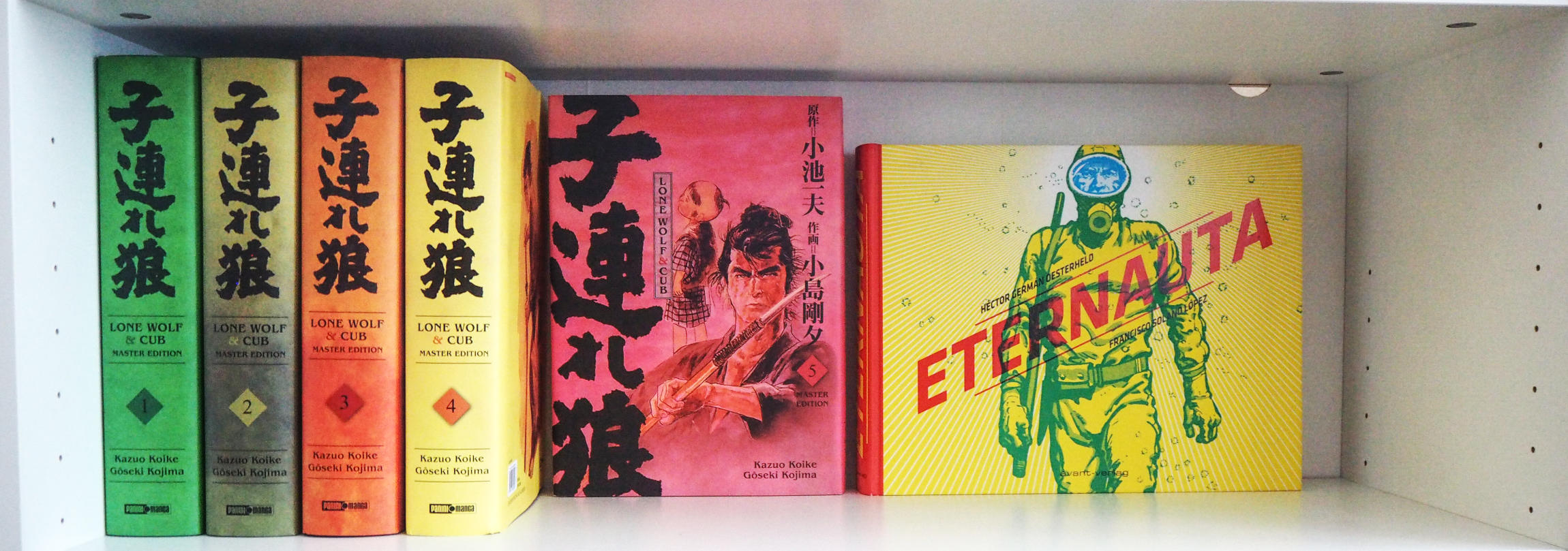 Den Ausflug durch meine kleine Sammlung möchte ich mit einem Blick auf den Comic und Manga Bereich beenden. Eine Reihe, die mich seit einiger Zeit fesselt, ist Kazuo Koikes und Goseki Kojimas Lone Wolf & Cub. Der Carlsen Verlag hat diesem Klassiker mit wirklich gewaltigen und für den Manga-Bereich sehr hochwertigen Einbänden einen angemessenen Rahmen gegeben. Eine Reihe, die übrigens auch etwas für Leser ist, denen Mangas sonst zu bunt und verspielt sind. Mobil ist man mit diesen gewaltigen Bänden allerdings nicht.