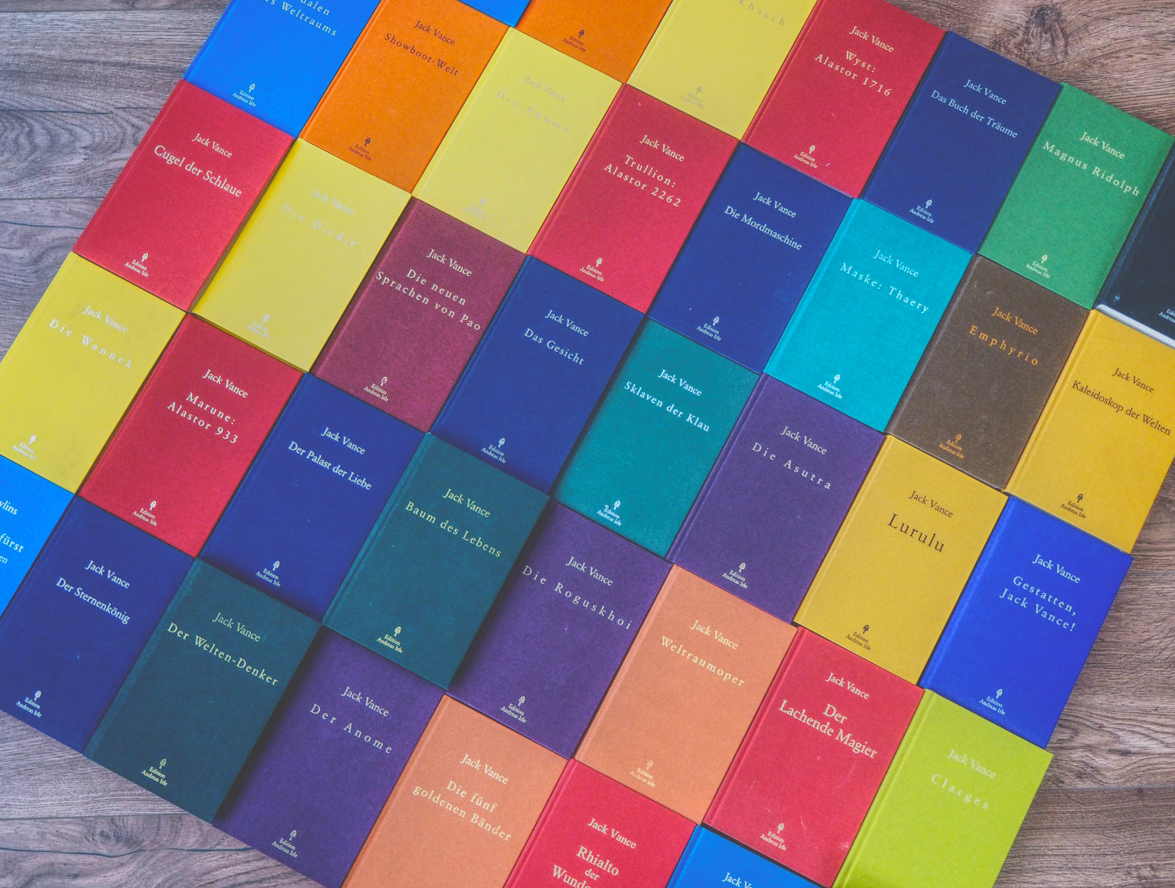 Ein Stück weit weniger auffällig hält es die Edition Andreas Irle. Ziel des Verlages ist es, das außergewöhnliche Gesamtwerk des – hierzulande immer noch sträflich vernachlässigten – Jack Vance in hochwertigen Liebhaberausgaben zu veröffentlichen. Dazu bedient man sich wiederum feinster Leineneinbände, Goldprägungen und eines zeitlosen und schlichten, dafür aber umso eleganteren Konzepts. Hinzu kommt, dass einzelne Reihen des Autors mit unterschiedlichen Farben bedacht wurden, sodass sich bei einer entsprechend großen Sammlung ein farbenprächtiges Bild ergibt.